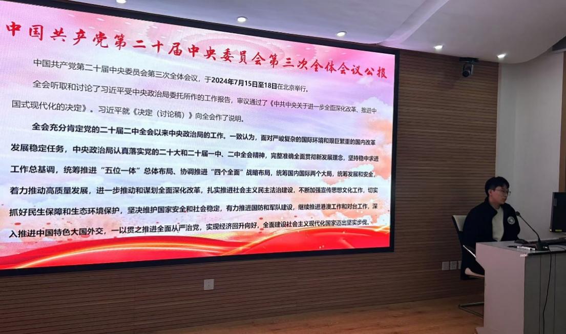 何艳娇同志就党的二十届三中全会通过的《中共中央关于进一步全面深化改革、推进中国式现代化的决定》中提到的习近平总书记关于全面深化改革的一系列新思想、新观点、新论断和中央银行制度两个方面进行了分享,并让党员同志观看有关中央银行制度的视频。陈婷婷同志就党的二十届三中全会通过的《中共中央关于进一步全面深化改革、推进中国式现代化的决定》中提到的“三个更加注重”、现代环境治理体系的健全以及有关现代环境治理体系学术说明的三个方面进行了分享。