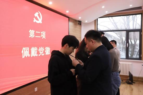 仪式在激昂的《国际歌》声中拉开序幕。李宜洺、周莹、赵宇娜、曹以伦四位党支部书记为新发展党员代表佩戴了党员党徽。