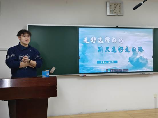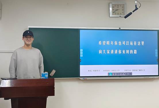 2021级工商管理专业王泽旭同志推免至中国人民解放军海军军医大学,他以幽默风趣的演讲风格向同学们分享了自己关于文书准备、院校选报和跨专业申请的经验,着重强调了要主动争取、利用一切可以接触到的平台资源,拓宽信息渠道。他通过回顾自己进入大学后从懵懂迷茫到奋起直追的经历,鼓励学弟学妹们无论何时都不要怀疑和放弃自己,事在人为,只要正视自己的梦想,遵从自己内心的选择,就一定能以持续的动力抵挡重重困难,拥有精彩而广阔的人生。