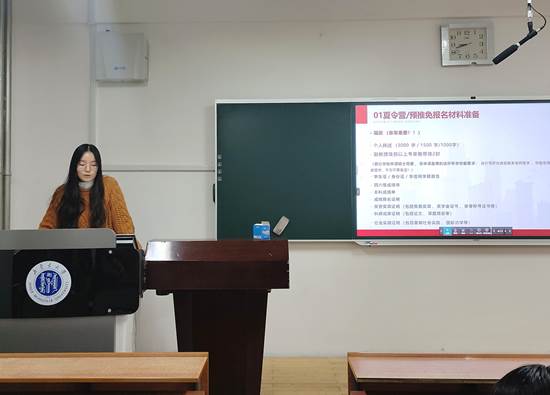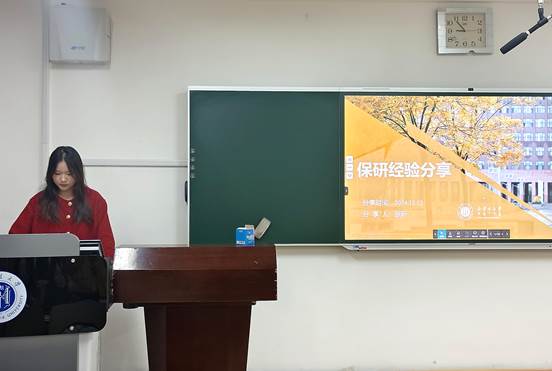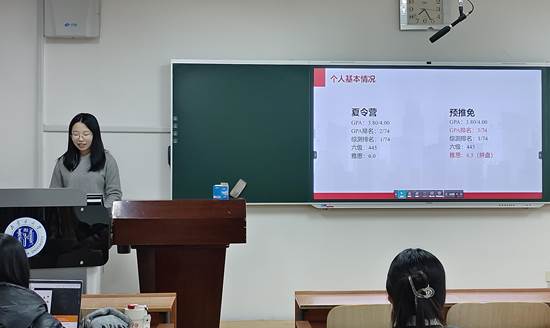 2021级会计学专业赵思颖同志推免至中国海洋大学,她深入浅出地介绍了推免面试过程中的重点、技巧和准备方法,启发同学们对自己进行合理定位,挖掘自身亮点,在面试过程中扬长避短。她告诉大家,思维逻辑与表达能力、临场应变能力都很重要,只有内强素质、外树形象,方能在推免的征途中走的更高更远。