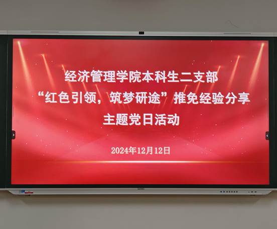 为进一步推进“青春领航”支部品牌建设,充分发挥学生党员的示范引领作用,永利集团304官网本科生二支部于12月12日晚7:00在卓越楼201教室举办“红色引领,筑梦研途”推免经验分享主题党日活动。活动邀请了六位2021级会计学、2021级工商管理学专业学生党员向大家分享自己的学习心得和推免经验。支部全体党员和部分入党积极分子、共青团员80余人参与了此次活动。