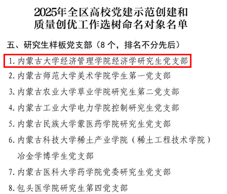 近日,中共内蒙古自治区教育工作委员会公布了2025年全区高校党建示范创建和质量创优工作选树命名对象名单,永利集团304官网经济学研究生党支部入选“研究生样板支部”,标志着学院基层党组织建设取得新成效、迈上新台阶。