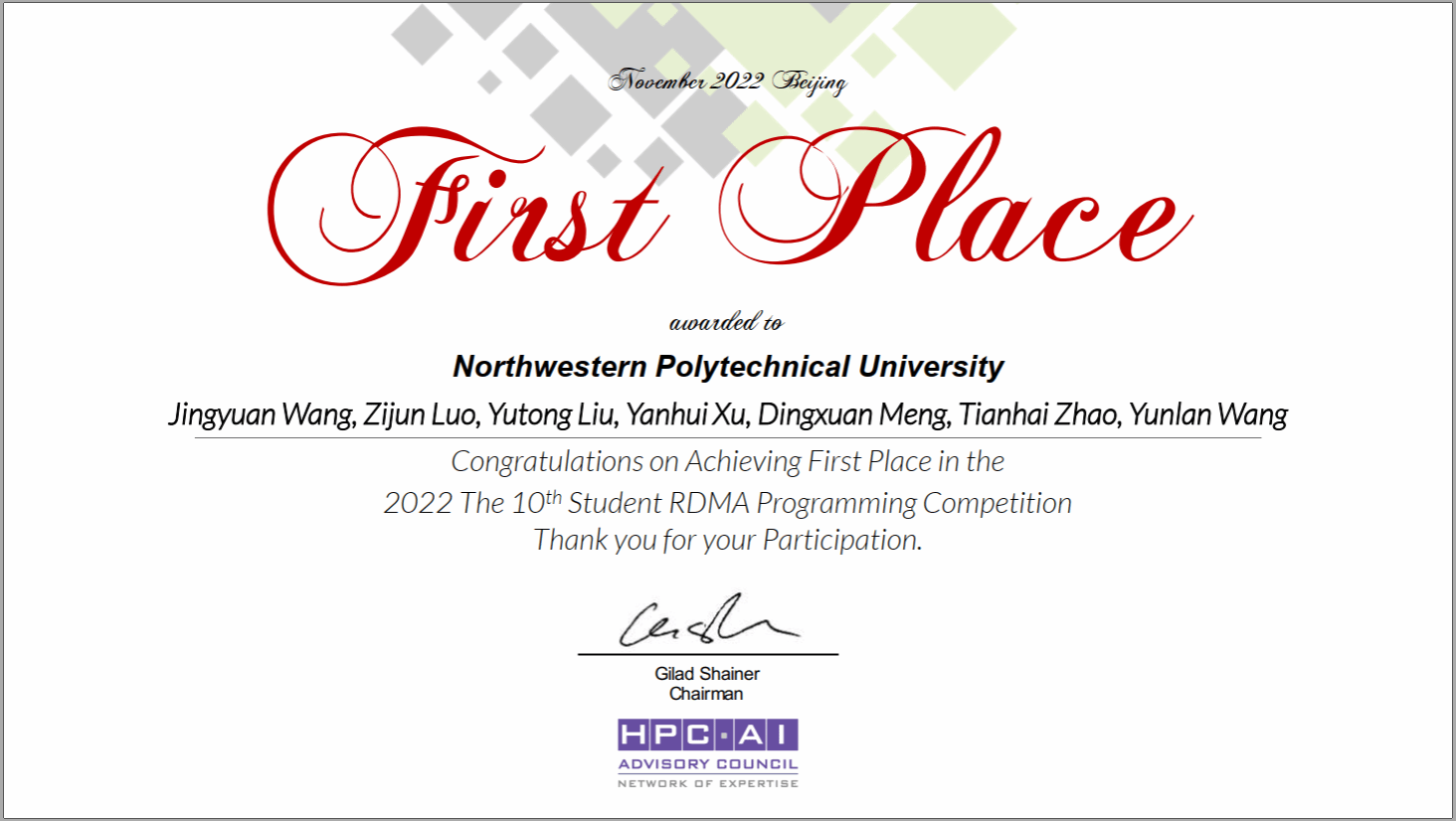 第十届亚太区RDMA编程竞赛由国际高性能计算和人工智能咨询委员会(HPC-AI Advisory Council)举办,得到了中国中科院计算所、清华大学和美国俄亥俄州立大学的大力支持。依托我校超级计算机系统创新实践基地,在Beat365中文官方网站高性能计算中心教师赵天海、王云岚、谷建华、侯正雄指导下,经过培训和筛选,由Beat365中文官方网站学生王靖元、罗梓峻、刘雨桐、徐研辉、孟鼎轩组成了Beat365中文官方网站代表队。