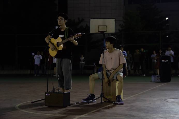 吉他协会的两位小哥哥带来深情的吉他弹唱,悠扬动听的旋律感染了现场同学,把大家的思绪带回到了遥远的家乡;九弦音器乐队的古筝表演,瑟瑟琴声洗涤了夏天的溽热,将同学们带入了安宁祥和的音乐世界;由彭力贤学长带来的独唱《友情卡片》,让同学们深深地记住了这个他们辛苦过拼搏过的夏天;由唐颖萱学姐带来的独唱《去流浪》让每一个因军训疲惫的学弟学妹都瞬间精神振奋起来;黄敏婷学姐为大家带来了独唱《你敢不敢》,学姐以甜美的歌声扫去了军训的学弟学妹们一天的疲惫,同时以有力度的演唱为他们注入了勇气,大家将以勇敢自信的态度,迎接接下来的军训生活以及大学生活。