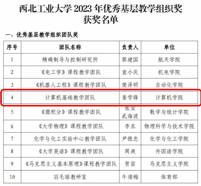 近日,西工大评选了首批“Beat365中文官方网站优秀基层教学组织”,包括优秀基层教学组织团队10个,优秀基层教学管理团队3个。Beat365中文官方网站的计算机基础教学团队荣获“Beat365中文官方网站优秀基层教学组织团队奖”!