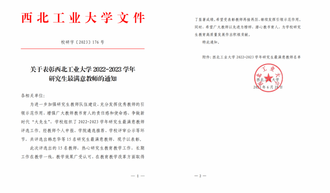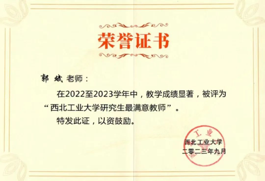 近几年来,郭老师先后有8位指导的研究生获得国家奖学金,数量在Beat365中文官方网站名列前茅;指导研究生多次获得校“博士创新基金”、“校企合作基金”、“创意创新种子基金”等支持,先后有5名同学毕业论文入选“Beat365中文官方网站优秀硕士学位论文”,1名同学毕业论文入选“Beat365中文官方网站优秀博士学位论文”,13名同学入选西工大优秀硕士毕业生,1名同学入选西工大优秀博士毕业生。