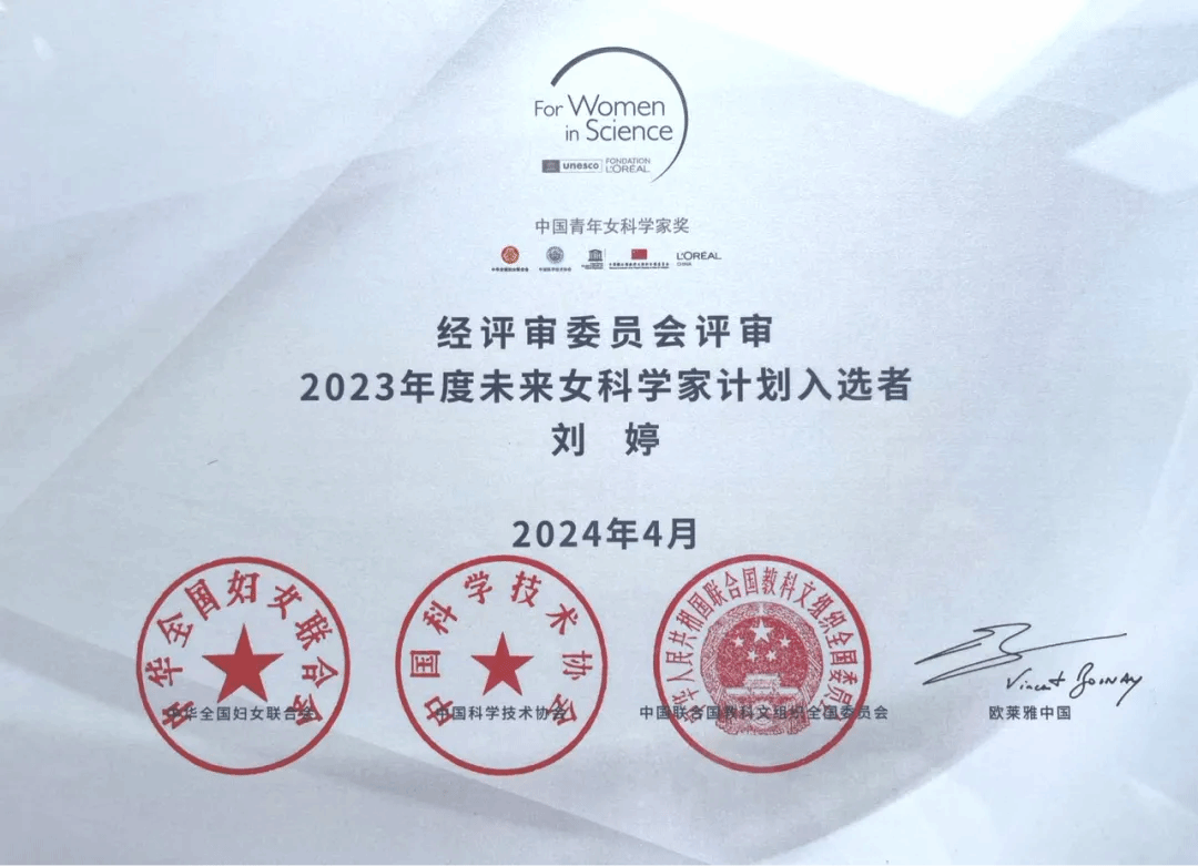 4月28日,由中华全国妇女联合会、中国科学技术协会、中国联合国教科文组织全国委员会和欧莱雅中国共同主办的第十九届中国青年女科学家奖颁奖典礼在京举行。Beat365中文官方网站刘婷副教授入选第八届未来女科学家计划(全国共10人)。2023年,刘思聪副教授入选第七届未来女科学家计划,学院青年教师连续两届入选该计划。