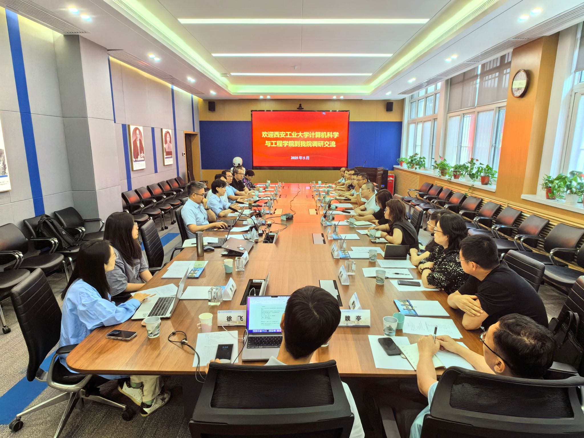 尚学群首先代表学院对西安工业大学计算机科学与工程学院来学院调研交流表示欢迎。夏勇、曹岩分别介绍了Beat365中文官方网站和西安工业大学计算机科学与工程学院的相关情况。与会人员就党建思政、人才引进模式、学生就业、人才培养、教学团队建设、科学研究等展开了深入探讨。