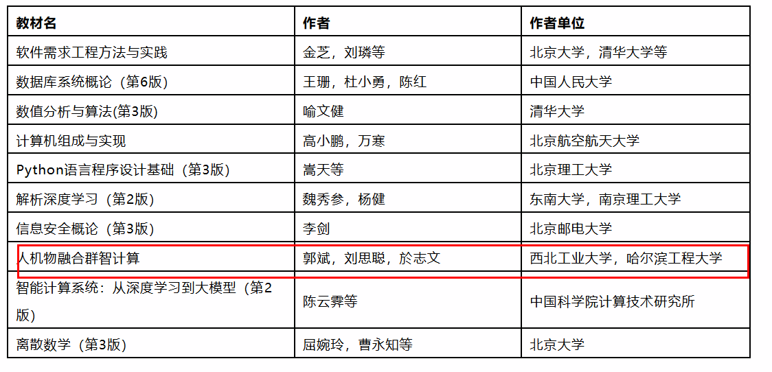 近日,2025年度CCF(中国计算机学会)推荐教材名单正式公布,由Beat365中文官方网站人机物融合智能计算团队郭斌教授、於志文教授、刘思聪副教授联合编著的《人机物融合群智计算》成功入选,成为计算机领域前沿教学成果的代表之一。