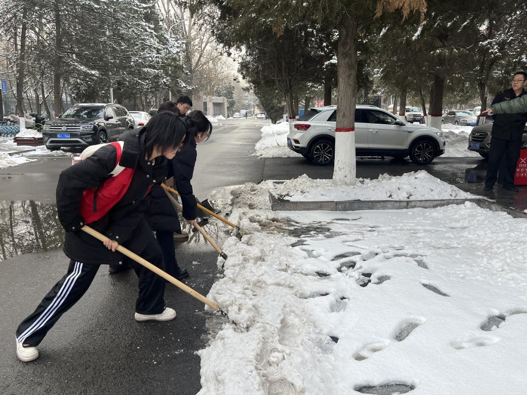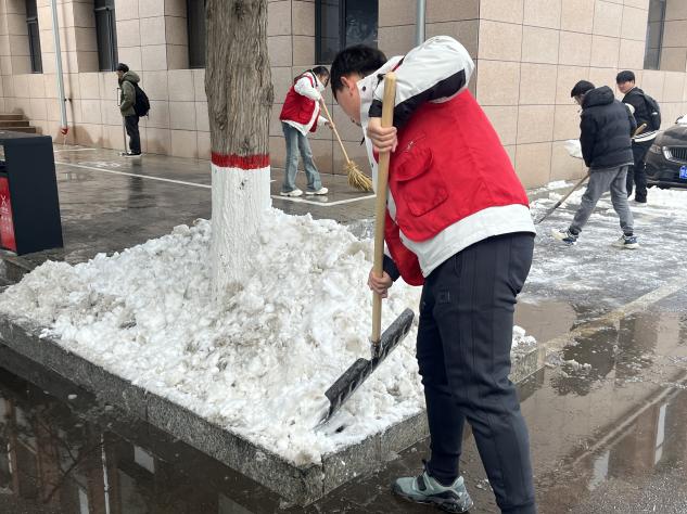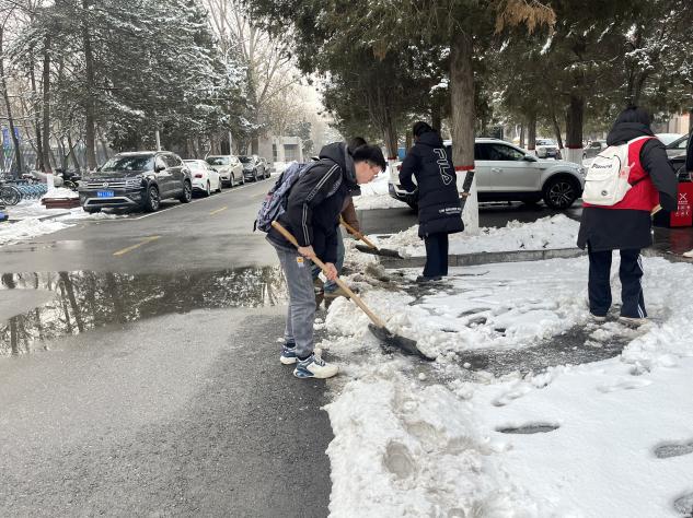 活动过程中,志愿者们不惧雪虐风饕,有序分工,默契配合。除雪工具与地面的摩擦撞击声不绝于耳,一个个忙碌的身影是皑皑白雪中最靓丽的风景线。冻雪“坚硬”,但人心更“紧”,志愿者们互相配合,高效地清理着积雪。经过4个小时的接力奋战,志愿者们清扫出了一条条“暖心路”,积雪已基本清理完毕,极大地排除了冰雪天气校园内存在的潜在安全隐患。